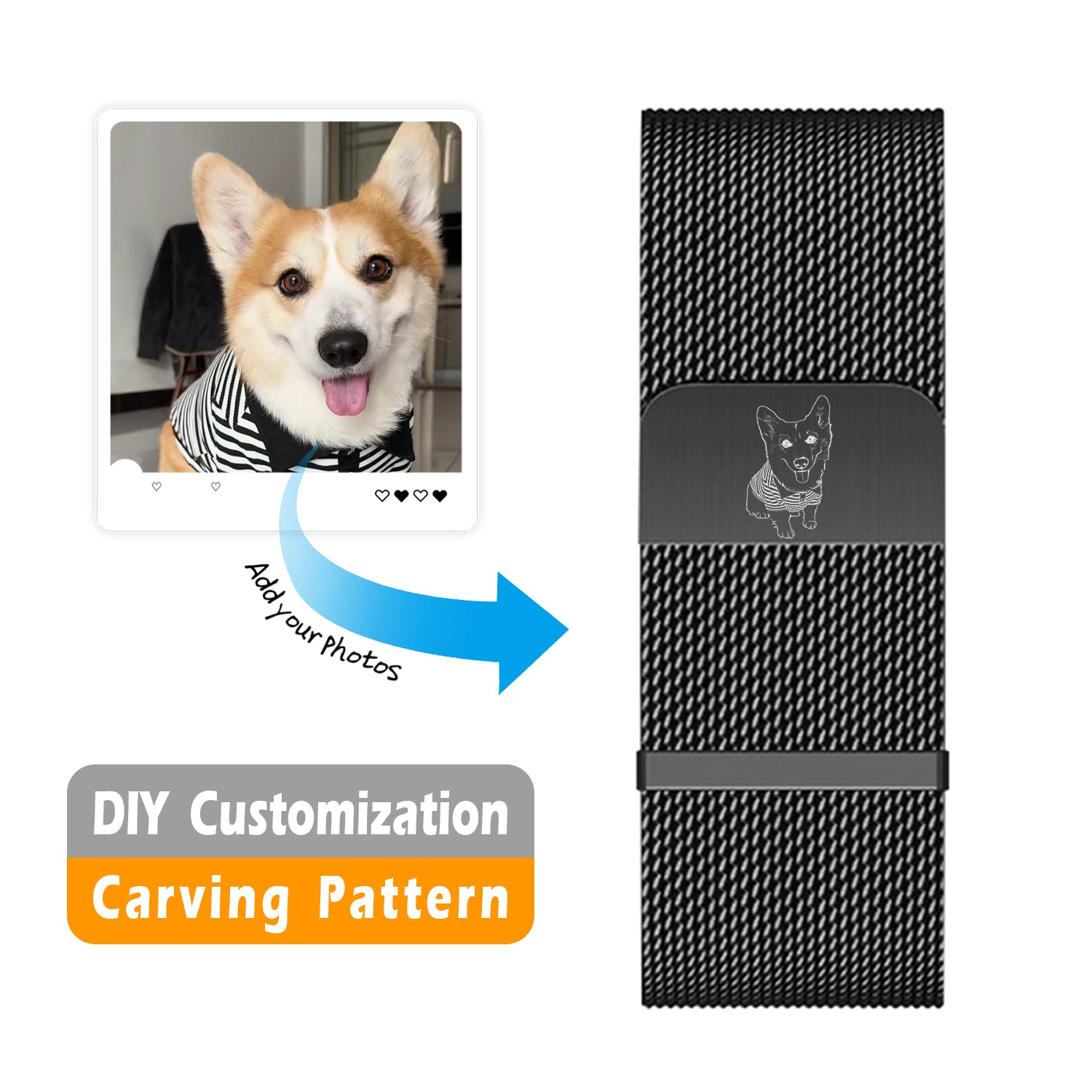 The most heartfelt detail lies in the band’s magnetic metal buckle. Not only does it have strong magnetic force—easy to put on with a gentle click and take off with a simple pull—it also serves as an “exclusive photo frame” for his memory. First, we refine the details of the Corgi photo he provided: clearly outlining the curve of the Corgi’s grinning mouth, the lines of its floppy ears, and even delicately enhancing the sparkle in its eyes. This polished image is then converted into a high-precision stamping template.